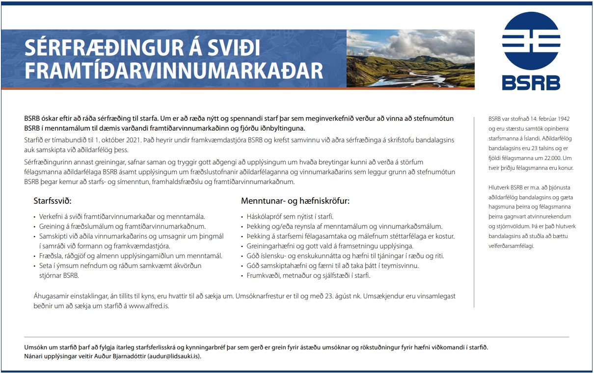 BSRB óskar eftir því að ráða sérfræðing á sviði framtíðarvinnumarkaðar til starfa. Meginverkefni viðkomandi verður að vinna að stefnumótun bandalagsins í menntamálum, til dæmis varðandi framtíðarvinnumarkaðinn og fjórðu iðnbyltinguna.
