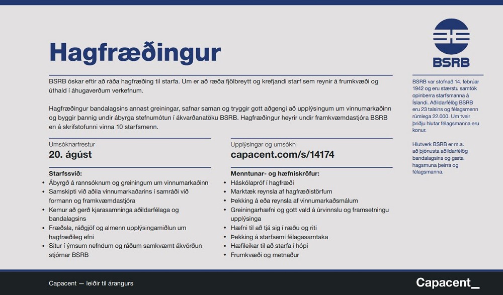 Nánari upplýsingar um starfssvið og menntunar- og hæfniskröfur má finna á vef Capacent þar sem einnig er hægt að skila inn umsókn. Umsóknarfrestur er til og með 20. ágúst 2019.