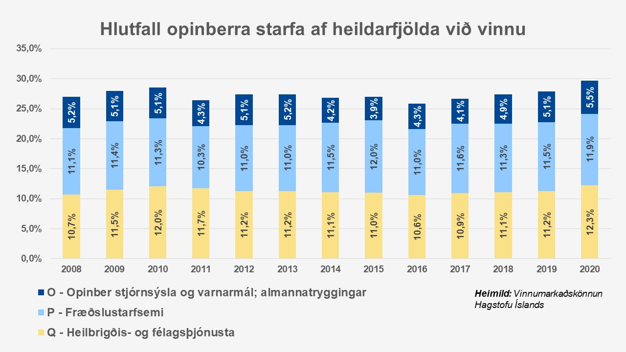 Almennt er ekki að sjá að miklar breytingar hafi verið á því hve hátt hlutfall starfar innan þeirra atvinnugreina sem skilgreina má sem opinberar greinar á árunum 2008 til 2020, eins og sjá má á myndinni hér að neðan. Hlutfallið hækkar nokkuð árið 2009 vegna fækkunar starfa á almennum markaði í kjölfar hrunsins, en breytist svo lítið allt til 2019. Allnokkur aukning verður árið 2020, en hækkandi hlutfall það ár skýrist fyrst og fremst af fækkun starfa á almennum markaði.