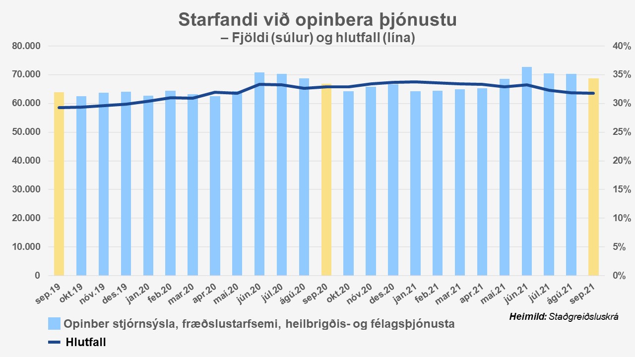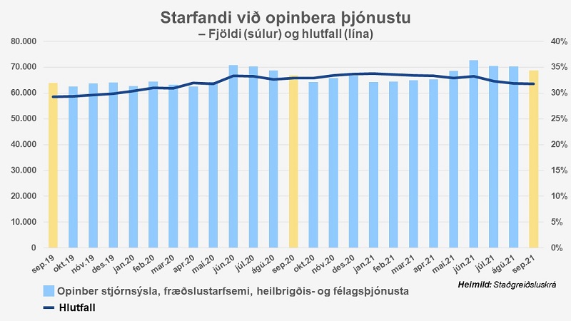 Þegar fjöldi opinberra starfsmanna er skoðaður í samhengi við fjölda landsmanna hefur hlutfallið verið svipað frá árinu 2008, í kringum 13 prósent. Lítilleg hlutfallsleg fjölgun hefur verið síðustu tvö ár en hún tengist fyrst og fremst heimsfaraldrinum.