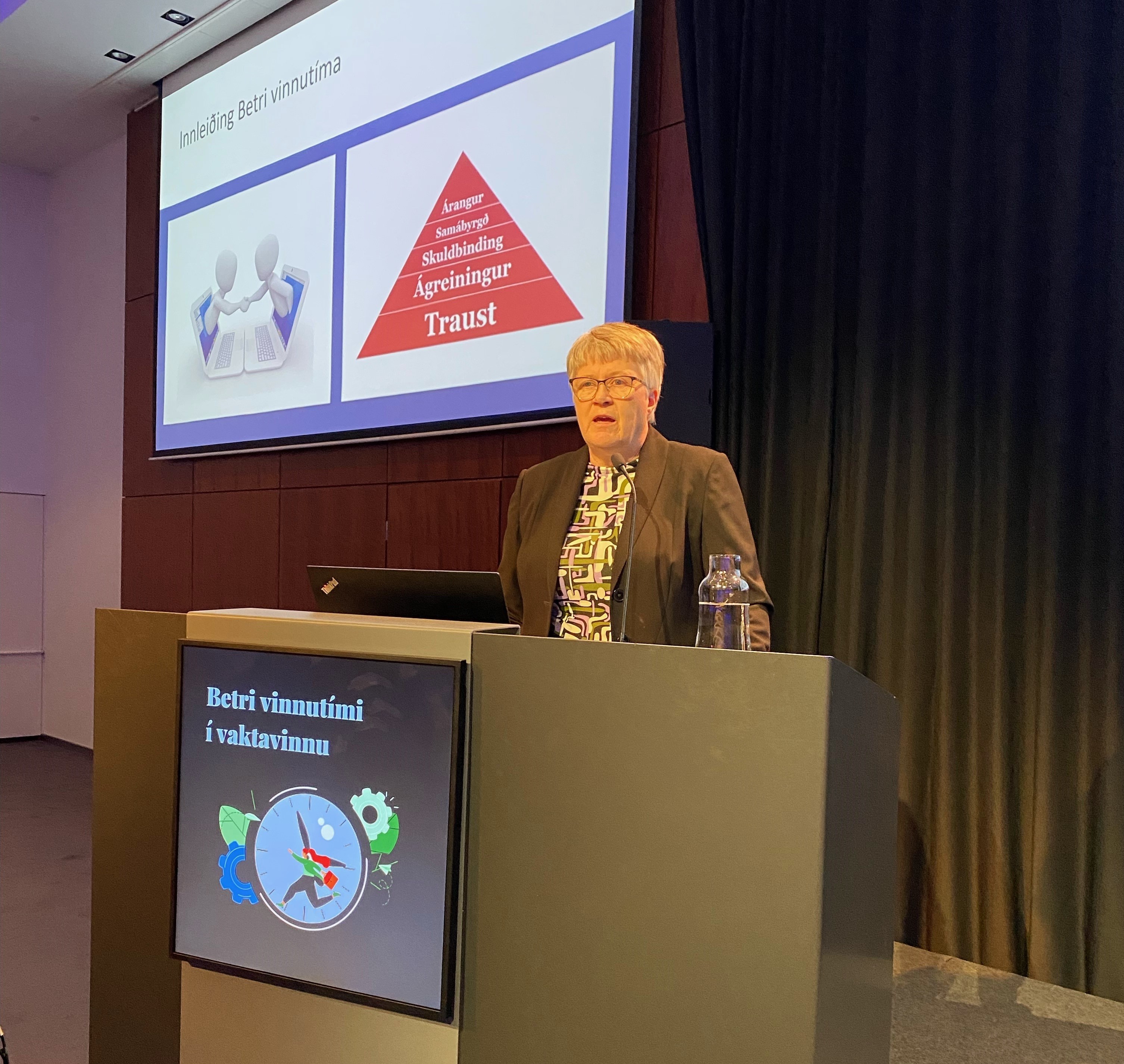 Á meðal dagskrárliða voru einnig reynslusögur af innleiðingu styttingar vinnuvikunnar frá fimm mismunandi aðilum, Gyða Hrönn Einarsdóttir frá Landsspítala