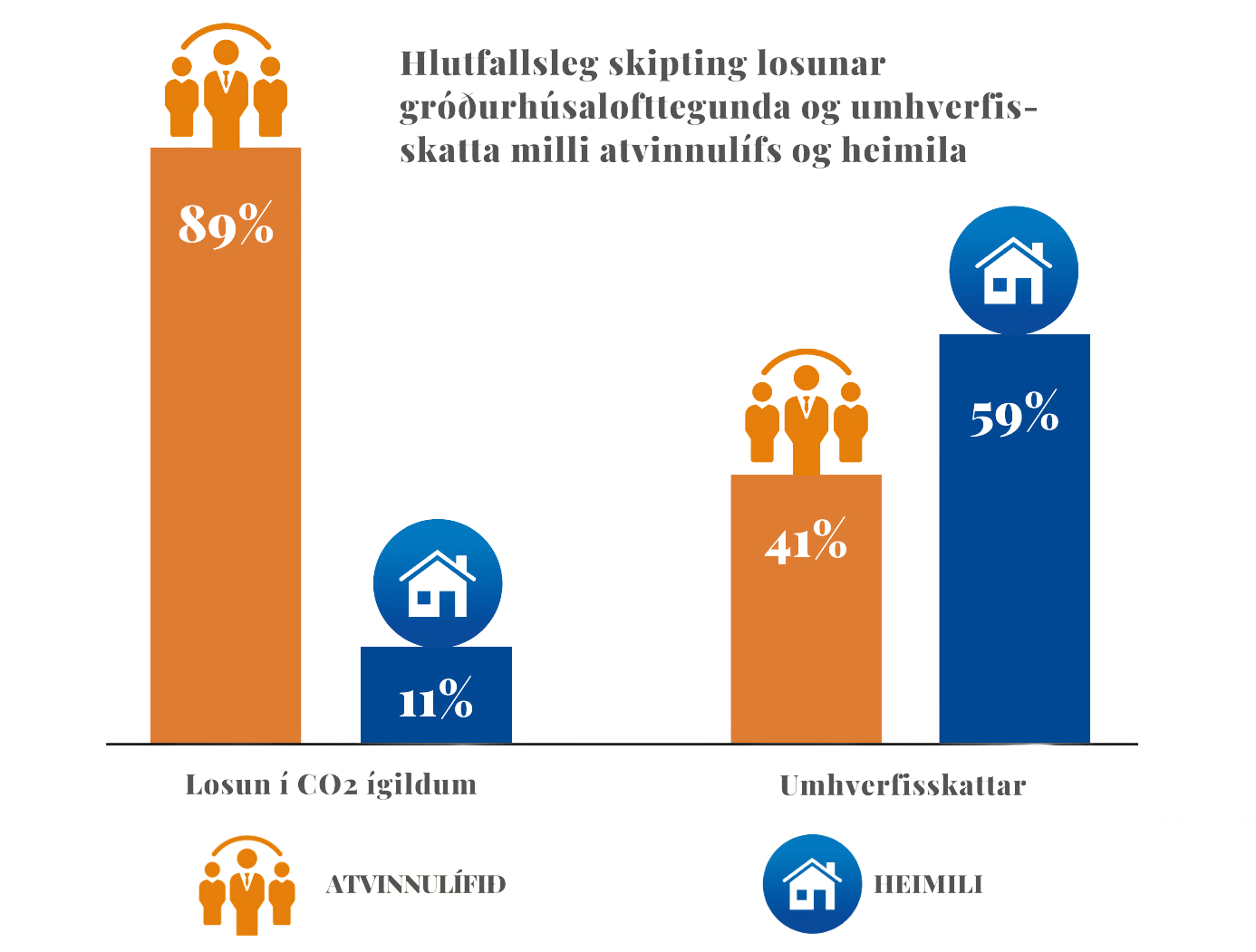 Í nýbirtum gögnum Hagstofu Íslands kemur fram að heimili greiða meirihluta umhverfisskatta á Íslandi eða 59%, sem er eitt hæsta hlutfall í Evrópu. Alls greiddu heimilin um 32 milljarða króna í umhverfisskatta árið 2020 en atvinnulífið og erlendir aðilar um 22 milljarða. Þetta er í engu samræmi við losun gróðurhúsalofttegunda því atvinnulífið á Íslandi ber ábyrgð á tæpum 90% losunar og heimilin 11%. Svo virðist sem stjórnvöldum þyki sjálfsagt mál að heimilin á Íslandi séu látin axla ábyrgðina á skattgreiðslum til að stemma stigu við losun. Frá árinu 2012 hafa hins vegar þau sem kaupa rafmagnsbíla og tengiltvinnbíla notið skattaívilnana vegna kaupa á nýjum rafmagns- og tengiltvinnbílum svo hluti rennur aftur til heimilanna. BSRB hefur bent á að það séu frekar tekjuhærri heimili sem kaupi slíka bíla og að kolefnisgjöld og önnur gjöld af jarðefnaeldsneyti leggist hlutfallslega þyngst á tekjulægstu heimilin. Því má segja að tekjulægri heimili á Íslandi hafi niðurgreitt kaup tekjuhærri heimila á grænorkubifreiðum undanfarin 10 ár og axlað ábyrgð á hluta losunar atvinnulífsins.