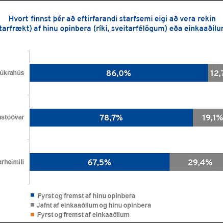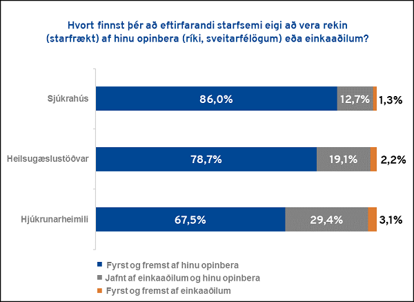Mikill meirihluti vill einnig að það sé fyrst og fremst hið opinbera sem reki heilsugæslustöðvar, alls 78,7%. Aðeins 2,2% vilja að rekstur heilsugæslustöðva sé fyrst og fremst á hendi einkaaðila. Þá vill stór hluti þjóðarinnar, 67,5%, að hið opinbera reki hjúkrunarheimili en aðeins 3,1% vilja fyrst og fremst fela einkaaðilum rekstur þeirra.