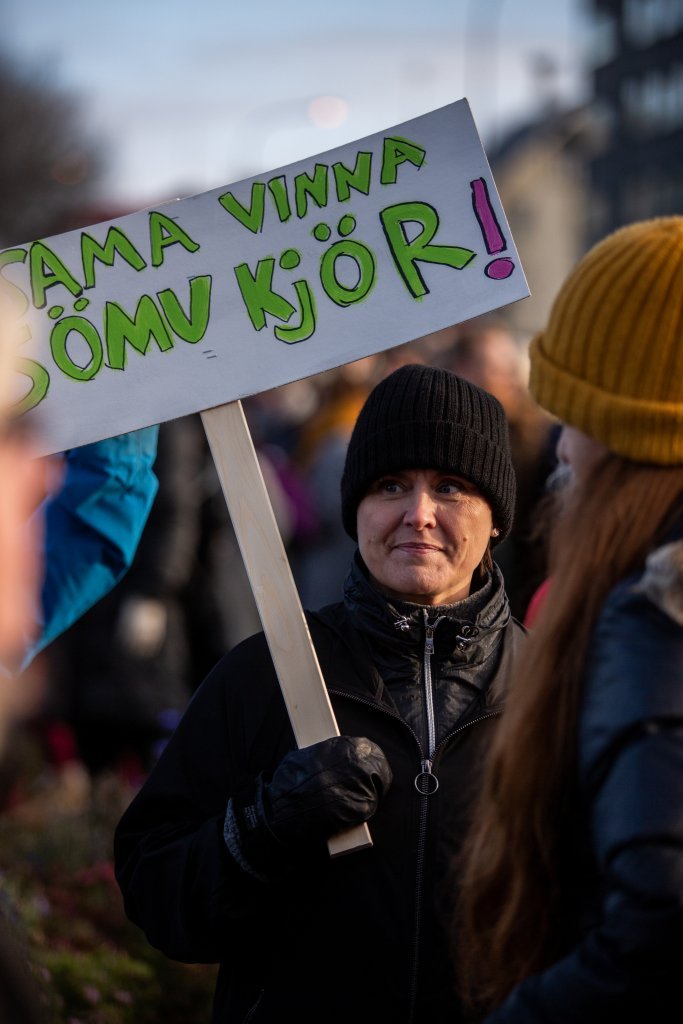 - Við krefjumst aðgerða og kynjakvóta til að auka hlut kvenna í áhrifa- og valdastöðum og að kvennastörf séu metin að verðleikum bæði í launum og virðingu.
