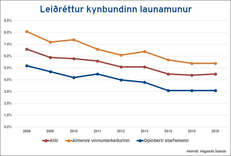 Launamunurinn var talsvert meiri árið 2008. Þá var leiðréttur launamunur að meðaltali 6,6 prósent, 8,1 prósent á almennum vinnumarkaði en 5,2 prósent hjá hinu opinbera.