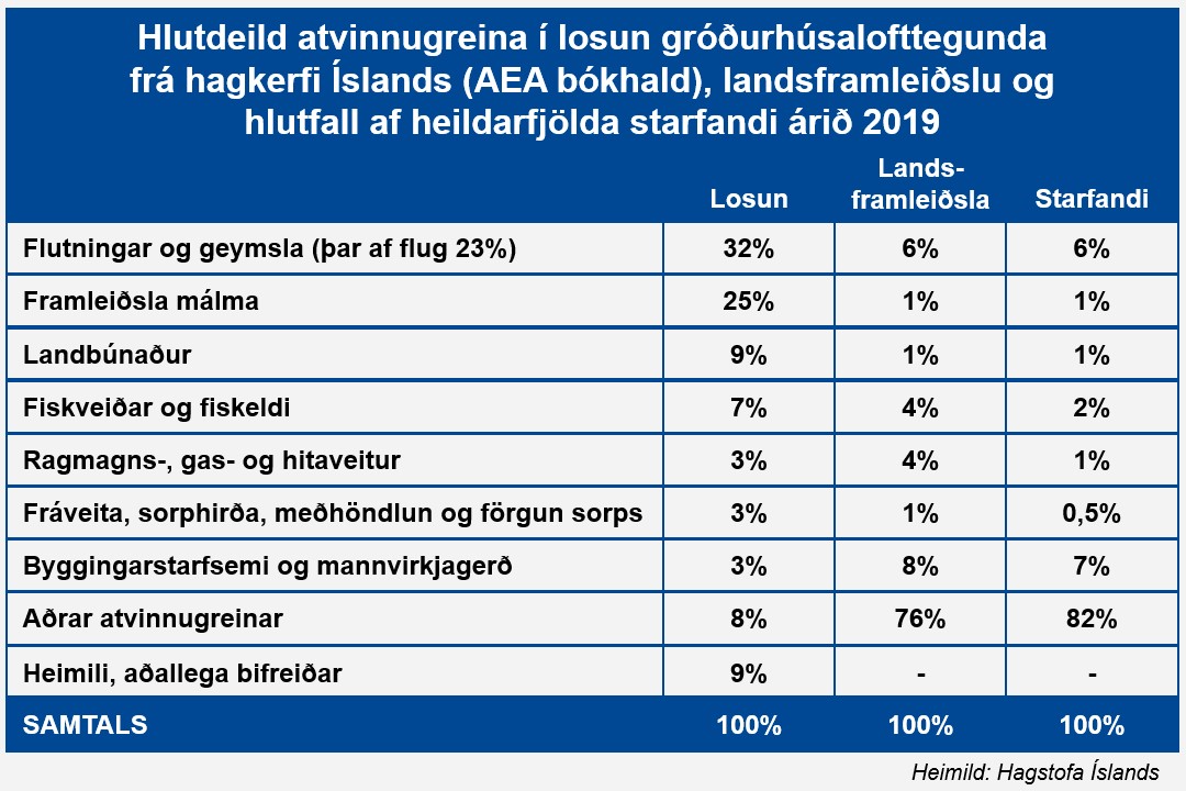 Þær fjórar atvinnugreinar sem valda um 75% af losun íslenska hagkerfisins, leggja um 12% til landsframleiðslunnar og um 10% af starfandi vinna í þessum greinum. Þar með er ekki öll sagan sögð. Þrjár þessara greina, flutningar með flugi, framleiðsla málma og sjávarútvegur eru burðargreinar þegar kemur að því að skapa útflutningsverðmæti og hafa mikil áhrif á afkomu í öðrum atvinnugreinum landsins. Það er því mikið í húfi að þessar greinar nái að draga úr losun án þess að það dragi úr framleiðsluvirði þeirra. Til þess þarf miklu markvissari aðgerðir, fjárfestingu og starfsfólk sem getur tekist á við breytingar innan greinanna. Rétt er að taka fram að flug heyrir undir alþjóðlegt kerfi flugsins um samdrátt í losun og málmframleiðsla undir Evrópska viðskiptakerfið með losunarheimildir.