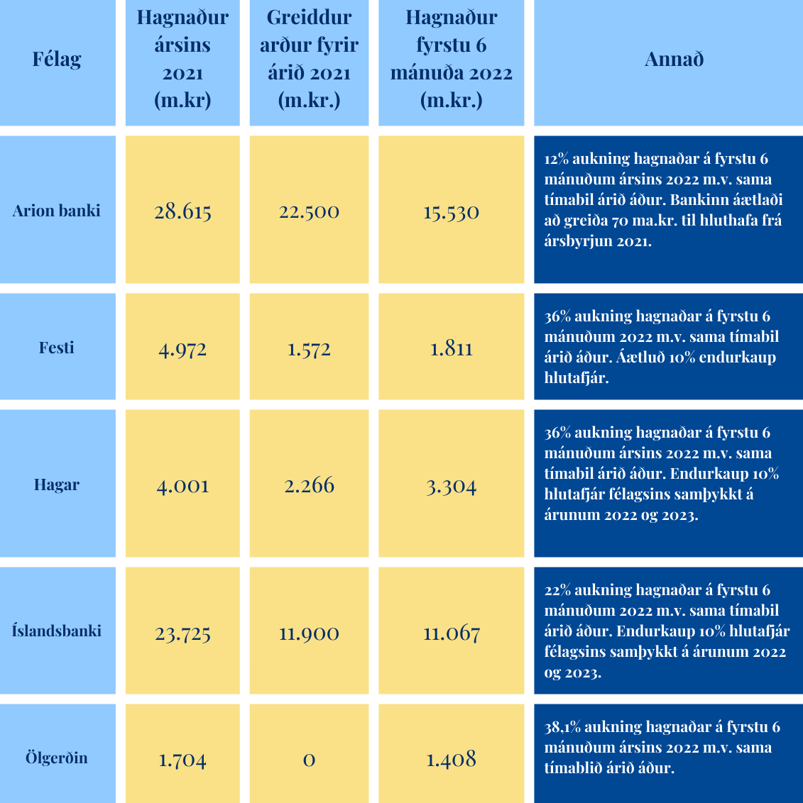 Þessi fimm fyrirtæki eru meðal þeirra fyrirtækja sem móta viðskiptakjör almennings. Samanlagðar arðgreiðslur þeirra vegna síðasta árs, þegar faraldurinn stóð sem hæst, námu rúmum 38 milljörðum króna og nema áætluð endurkaup hlutabréfa tugum milljarða á næstu tveimur árum. Það stefnir í enn meiri hagnað á árinu 2022 miðað við rekstrarniðurstöðu fyrri helmings ársins. Jákvæð afkoma einskorðast þó ekki við ofangreind fyrirtæki og má í því samhengi nefna að hagnaður sjávarútvegsfyrirtækja landsins jókst um 124% á milli áranna 2020 og 2021. Þessar niðurstöður sýna svo ekki verður um villst að það er nóg til. Í þessu ljósi er erfitt að skilja af hverju ríkisstjórnin leggur til að afla tekna með frekari álögum á almenning í stað fyrirtækja.