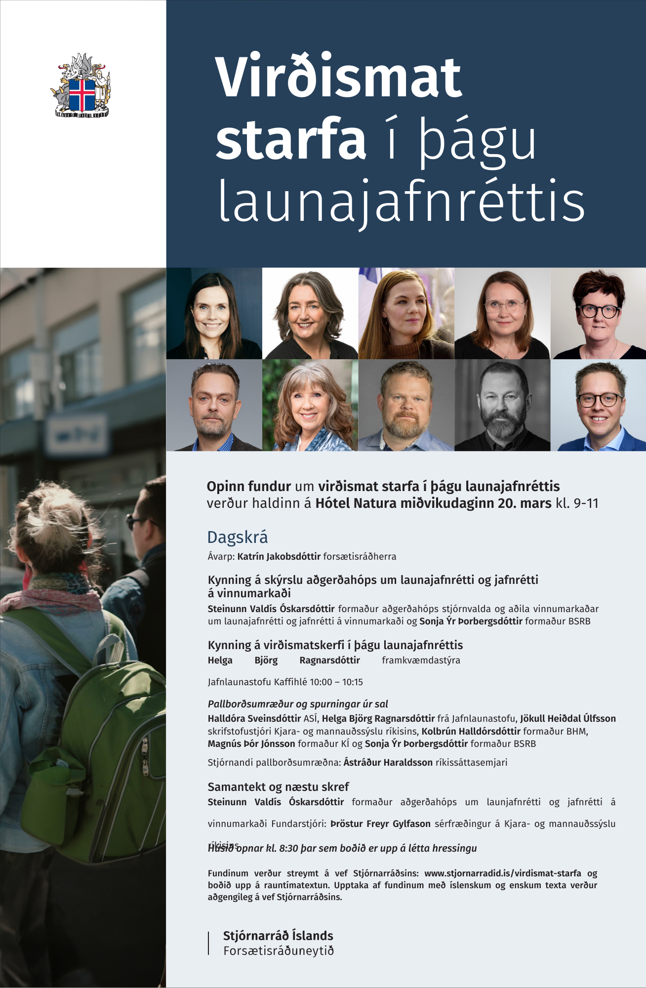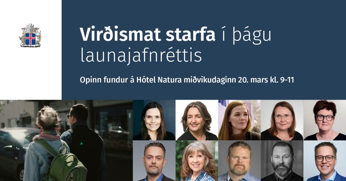 Forsætisráðuneytið býður til opins fundar þar sem rætt verður um virðismat starfa í þágu launajafnréttis. Fundurinn fer fram miðvikudaginn 20. mars nk. kl. 9-11 á Hótel Natura og verður jafnframt í beinu streymi.