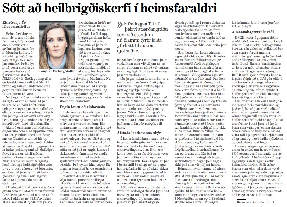 BSRB hefur í gegnum tíðina staðið vörð um opinbert heilbrigðiskerfi. Það er ekki sérhagsmunabarátta eða „hluti af pólitískri baráttu sumra forystumanna stéttarfélaga“, eins og leiðarahöfundur Morgunblaðsins virðist telja. Þessi áhersla bandalagsins er þvert á móti afrakstur stefnumótunar félagsmanna á þingum BSRB sem kjörin forysta bandalagsins fylgir að sjálfsögðu eftir á opinberum vettvangi. Áherslan endurspeglar almannahagsmuni og stuðning við öflugt opinbert heilbrigðiskerfi en ekki fjárhagslega sérhagsmuni fárra.