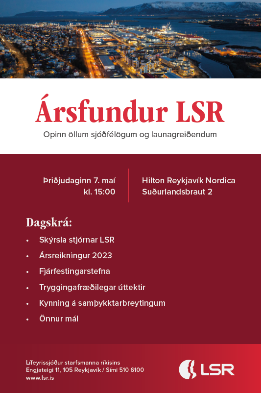 Ársfundur LSR verður haldinn þriðjudaginn 7. maí 2024, kl. 15:00, á Hilton Reykjavík Nordica, Suðurlandsbraut 2. Fundurinn er opinn öllum sjóðfélögum og launagreiðendum.