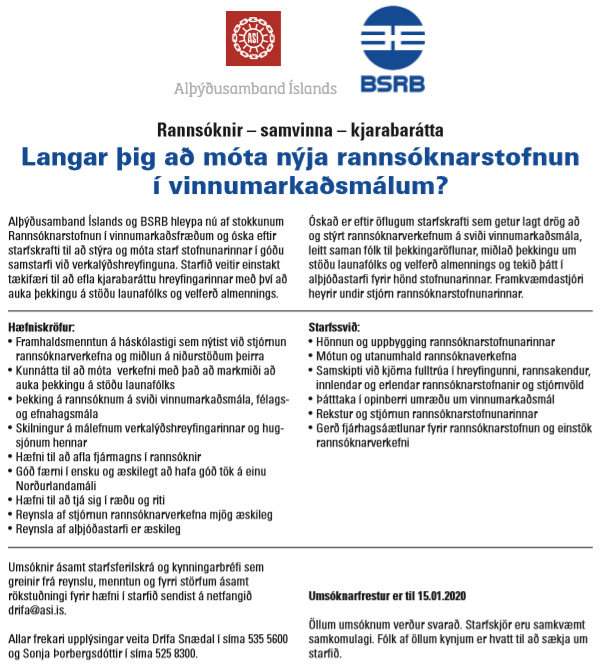 Frestur til að sækja um starf hjá framkvæmdastjóra hjá Vörðu – rannsóknarstofnun vinnumarkaðarins rennur út miðvikudaginn 15. janúar næstkomandi. Leitað er að öflugum starfskrafti til að stýra og móta starf þessarar nýju stofnunar sem BSRB og ASÍ stofnuðu seint á síðasta ári.