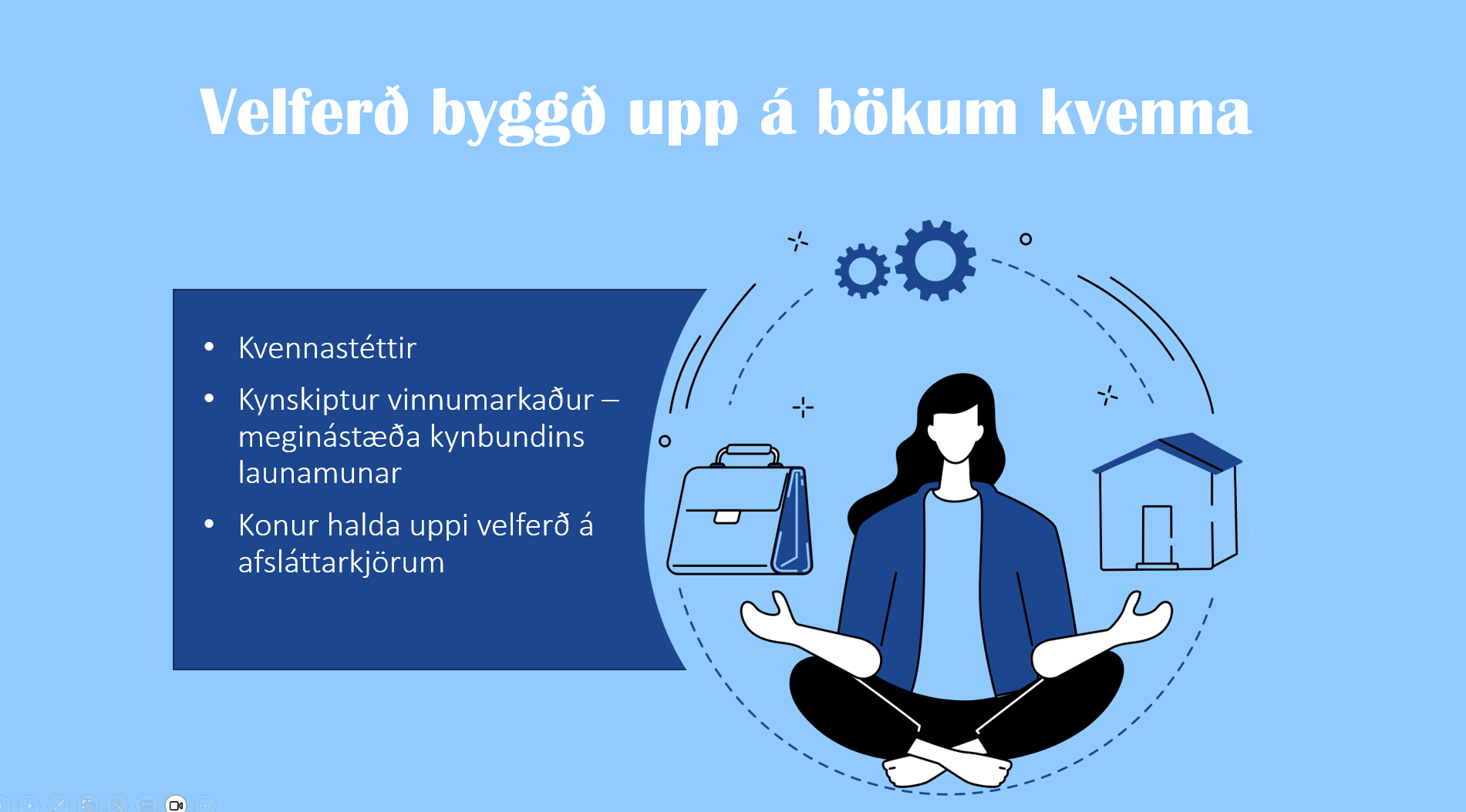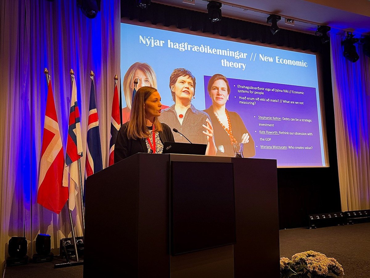 Í fyrirlestri sínum lagði hún áherslu á nýja nálgun við hagstjórn sem tekur mið af velsæld fólks. „Hagfræði hefur veruleg áhrif á stefnumótun og ákvarðanir stjórnvalda, á vinnumarkaði og við lagasetningu. Hagfræði er félagsvísindagrein en áherslan á stærðfræðileg rök í fræðunum leiðir til þess að nálguninni er gjarnan tekið sem raunvísindi. Þessi nálgun veitir falskt öryggi þar sem mikilvægir og órjúfanlegir þættir í okkar samfélagi á borð við heilsu, umhverfið og ójöfnuð eru ekki hluti af klassískum hagfræðimódelum.“ Nefndi hún til sögunnar þrjár konur, Stephanie Kelton, Kate Raworth og Mariana Mazzucato, allt hagfræðingar sem skora úreltar hagfræðikenningar á hólm.