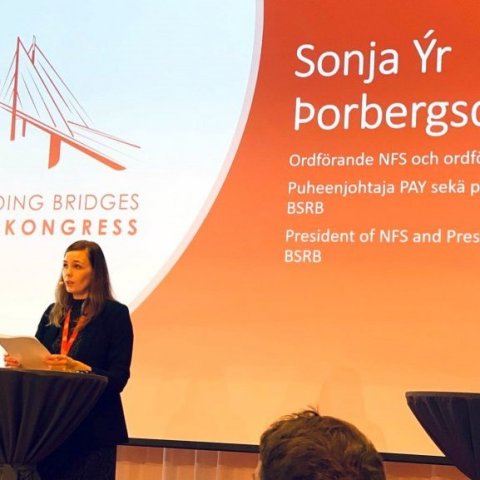 „Yfirskrift þingsins er „Að byggja brýr“, sem vísar til samvinnu okkar þvert á landamæri,“ sagði Sonja, sem er jafnframt stjórnarformaður NFS. Hún sagði það lýsandi fyrir þá hugsun sem hefur verið ríkjandi í norrænu verkalýðshreyfingunni þar sem áherslan hafi verið á samkeppnishæfni og sjálfbærni, bæði innan Norðurlandanna og innan Evrópu allrar.