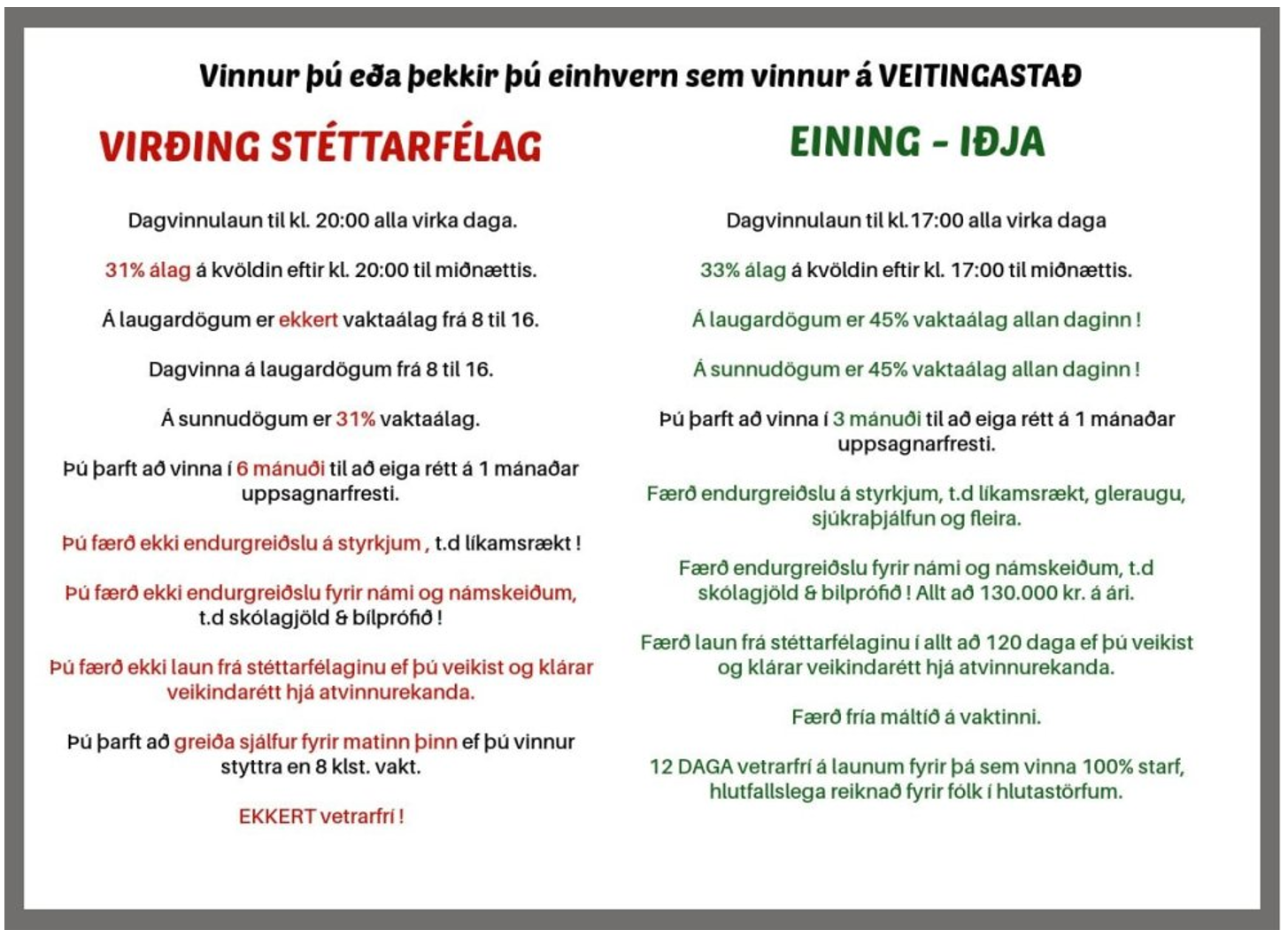 Þegar eru í gildi kjarasamningar um öll störf á veitingahúsum. Þar eru ákvæði um kjör og réttindi sem hafa náðst með áratugalangri baráttu launafólks. Það er ámælisvert að stéttarfélag fyrirtækja á veitingamarkaði skuli hafa samið slík réttindi burt með einu pennastriki til hagsbóta fyrir atvinnurekendur. Þar er meðal annars um að ræða verri launakjör, lakari orlofsrétt og uppsagnarrétt o.fl. eins og sjá má á samanburði Einingar-Iðju: