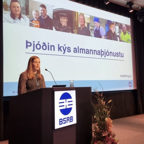 - 16Kæru félagar,. Þá er komið að lokum 45. þings BSRB. Þrátt fyrir stífa dagskrá hafa dagarnir liðið hratt og gleðin og vinnusemin verið allsráðandi. Saman höfum við mótað skýra stefnu BSRB til þriggja ára, átt öfluga umræðu og unnið ... verra en að vera jaðarsettur, sem var upphaflega meiningin. Það er nefnilega líka gaman á þingi BSRB þó málefnin séu auðvitað alvarleg. Undirstaða alls starfs BSRB. Ég vil þakka ykkur öllum kærlega fyrir ykkar framlag á þessu þingi ... . Það er ekki sjálfgefið að fólk geti tekið sér þrjá daga frá vinnu og fjölskyldu til að gefa af sér á þingi BSRB, sér í lagi þeir sem eiga börn í vetrarfríi! Framlag ykkar er undirstaða alls okkar starfs. Þið tryggið að stefna BSRB endurspegli sjónarmið félagsmanna ... fyrir að halda svona vel utan um þingið. Gefum þeim gott klapp!. Þá vil ég þakka starfsfólki BSRB og fráfarandi formanni fyrir alla þá vinnu sem þau lögðu í undirbúning þingsins og hér á þinginu sjálfu. Mögulega stytti ég vinnuvikuna ykkar ... frá okkur öllum. Takk enn og aftur fyrir allt. Framlag sem nýtist inn í framtíðina. Það er með þakklæti og gleði í huga sem ég slít 45. þingi BSRB. Þakklæti fyrir fyrirmyndarvinnubrögð, og fyrir góða og mikla vinnu. Ykkar framlag mun nýtast