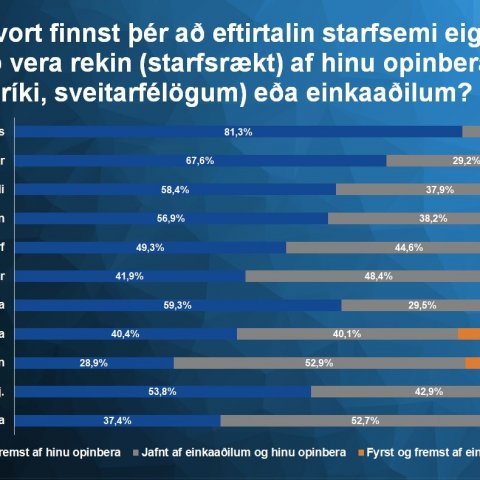 - 16á hagsmunatengsl þeirra sem setja hana fram. Talnaleikfimin felur ekki þá staðreynd að afgerandi meirihluti landsmanna er andvígur auknum einkarekstri í heilbrigðiskerfinu. Sú staðreynd ætti að blasa við þegar litið er til þess að um 81 prósent vilja ... við reksturs þess og fráleitt að gefa þeim þáttum sama vægi og veigamestu þáttum kerfisins eins og einhverjir gagnrýnendur hafa kosið að gera. Afar lítill áhugi á einkarekstri. Könnunin var unnin af Félagsvísindastofnun Háskóla Íslands ... fyrir Rúnar Vilhjálmsson, prófessor í félagsfræði við hjúkrunarfræðideild Háskóla Íslands, en BSRB greiddi fyrir könnunina. Eins og Rúnar benti á í fyrirlestri á opnum fundi þar sem niðurstöðurnar voru kynntar er áhugi almennings á einkarekstri