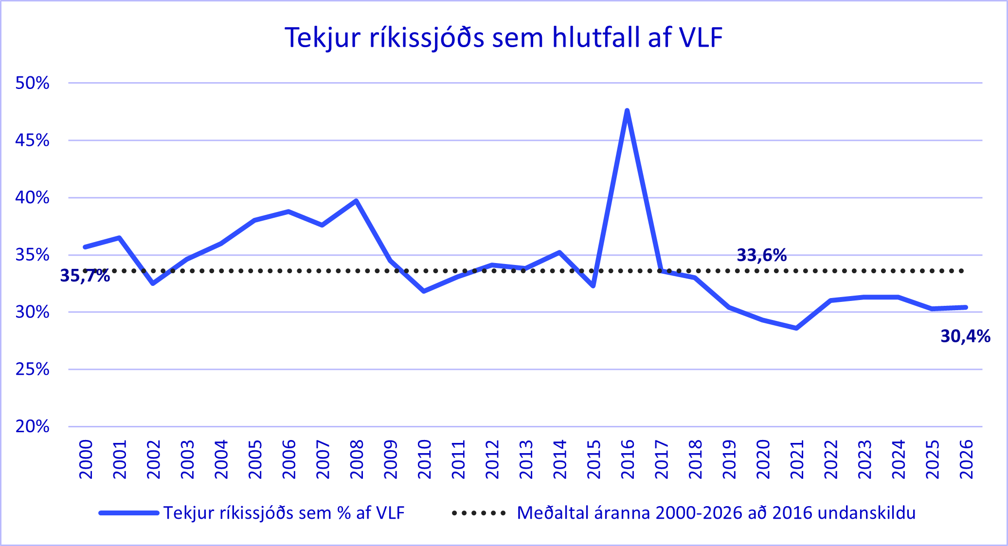 Tekjur ríkissjóðs sem hlutfall af landsframleiðslu hafa dregist velulega saman á sl. tæplega 10 árunum. Á myndinni er árið 2016 undanskilið í meðaltali enda voru einskiptistekjur ríkissjóðs nær 400 ma.kr. það ár vegna stöðugleikaframlags. Tekjuþróun hins opinbera í heild sinni sýnir sömu þróun.