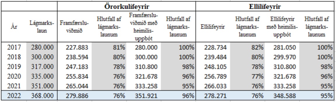 Frá og með árinu 2017 tóku breytingar á ellilífeyri almannatrygginga gildi. Þá var ellilífeyrir 82% af lágmarkslaunum og ellilífeyrir með heimilisuppbót sambærilegur lágmarkslaunum. Fjárhæðir framfærsluviðmiðs örokulífeyrisþega og ellilífeyris hafa verið nánast þær sömu á tímabilinu. Örorkulífeyriskerfið er þó mun flóknara og skerðingar þess kerfis margþættar.