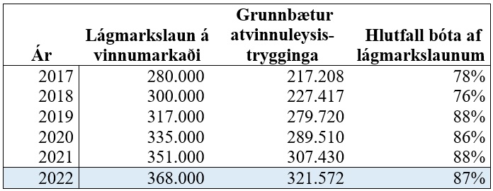 BSRB hefur um lengri tíma krafist hækkunar atvinnuleysisbóta og tekur undir kröfu ASÍ um að grunnbætur verði 95% af lágmarkslaunum á vinnumarkaði. Gert var samkomulag um hækkun bótana frá og með árinu 2019 enda höfðu fjárhæðir þeirra dregist aftur úr lágmarkslaunum. Þó var ekki vilji af hálfu ríkisstjórnarinnar að hækka bæturnar svo að þær jafngiltu 95% af lágmarkslaunum. Þessi staða bitnar nú á þeim þúsundum sem eru án atvinnu. Í meðfylgjandi töflu er sýndur samanburður á lágmarkslaunum og grunnbótum atvinnuleysisbóta m.v. 100% rétt á árunum 2017 til 2022. Samkvæmt forsendum frumvarpsins er gert ráð fyrir að atvinnuleysisbætur muni nema 321.572 kr. á mánuði árið 2022 en þær þyrftu að verða 349.600 kr. á mánuði svo að þær nemi 95% af lágmarkslaunum.
