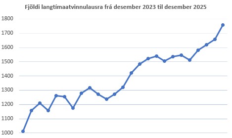 Ef horft er til hlutfalls af heildarfjölda á atvinnuleysisskrá, þá var hlutfall langtímaatvinnulausra 13,9% í desember 2023 en 18,3% í desember 2025. Auk þess gera efnahagsforsendur fjárlagafrumvarps ársins 2026 ráð fyrir auknu atvinnuleysi eða um 4,1% á yfirstandandi ári og 4% á árinu 2027, sem virðist þó vera bjartsýni miðað við nýjustu tölur Hagstofu Íslands [2].