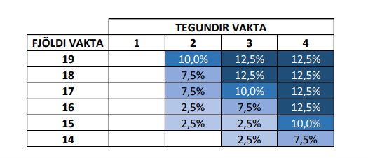 Vaktaálag er greitt vegna vinnu utan dagvinnumarka með eftirfarandi hætti:
